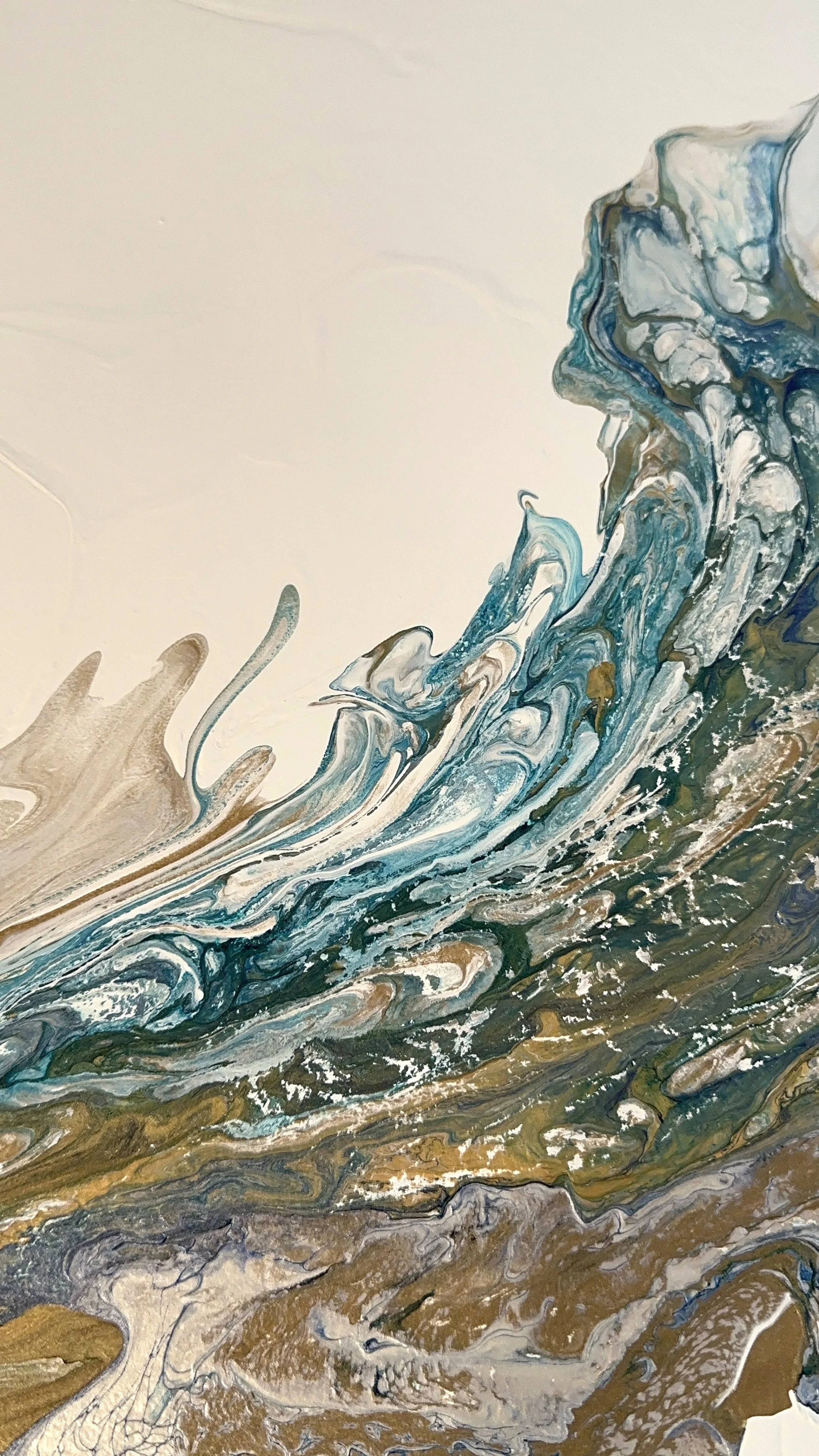 The dynamic diagonal movement across the vertical canvas was created to illustrate the bible verses found in the book of Nehemiah 8:9-12. The expansive white negative space represents The Holy Spirit and the light of God that surrounds the people gathered to hear God’s word with comfort and protection. The deep gold/bronze tones represent both strength and the stones at the Water Gate, where Nehemiah and Ezra proclaimed the word of God. The lighter, brighter gold represents our joy in the Lord and His invitation of rest, reflection, and His JOY. There are also two blues - one deep and one turquoise, both symbolize healing waters that give life and sustenance, flowing through and around the Water Gate. Also important for ceremonial purposes. The pearly, iridescent white is the purity of God’s promises in His Holy Word. The composition was designed to create strong movement and flow and emphasize the power of The Holy Word spoken by Nehemiah: