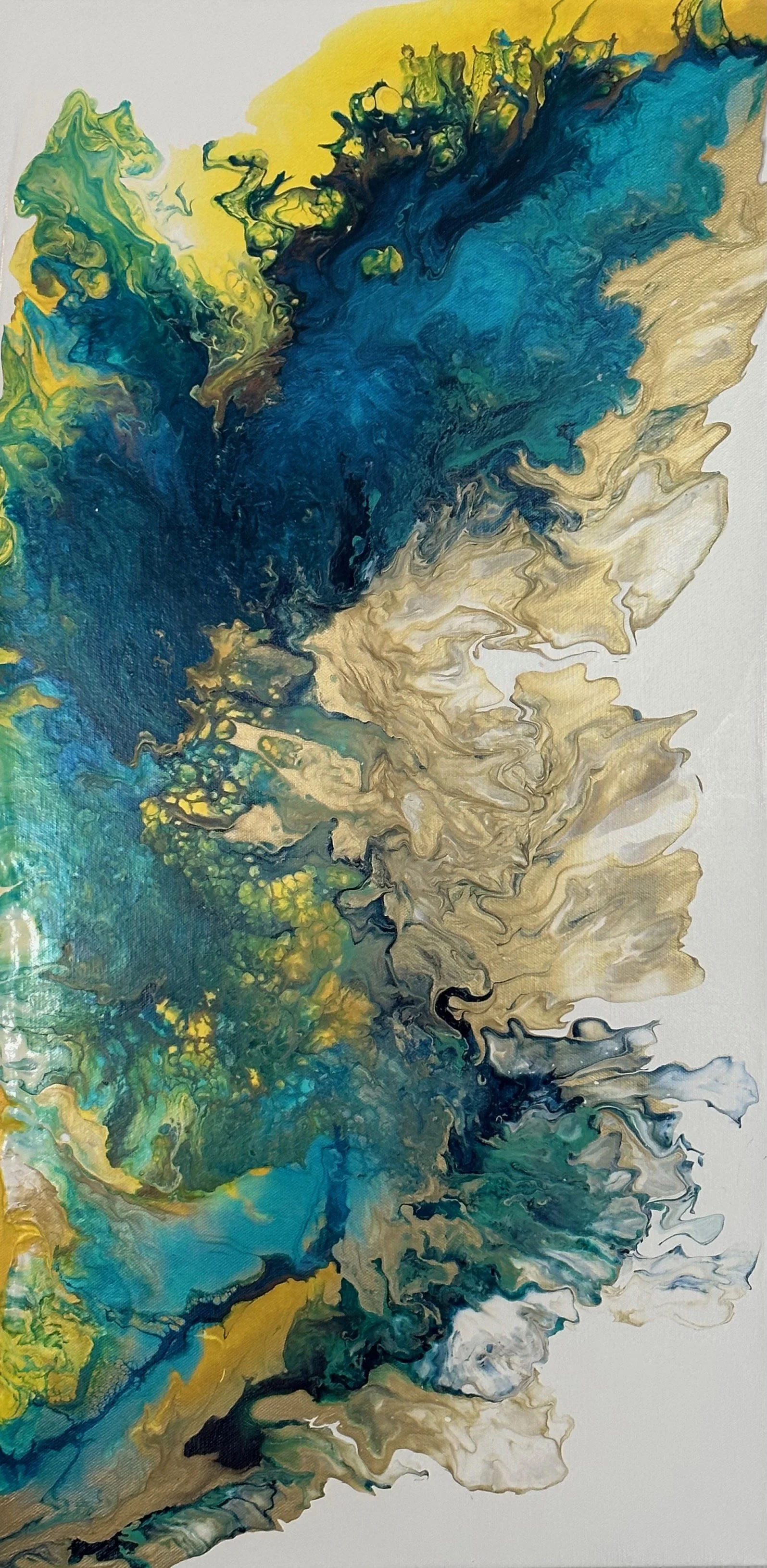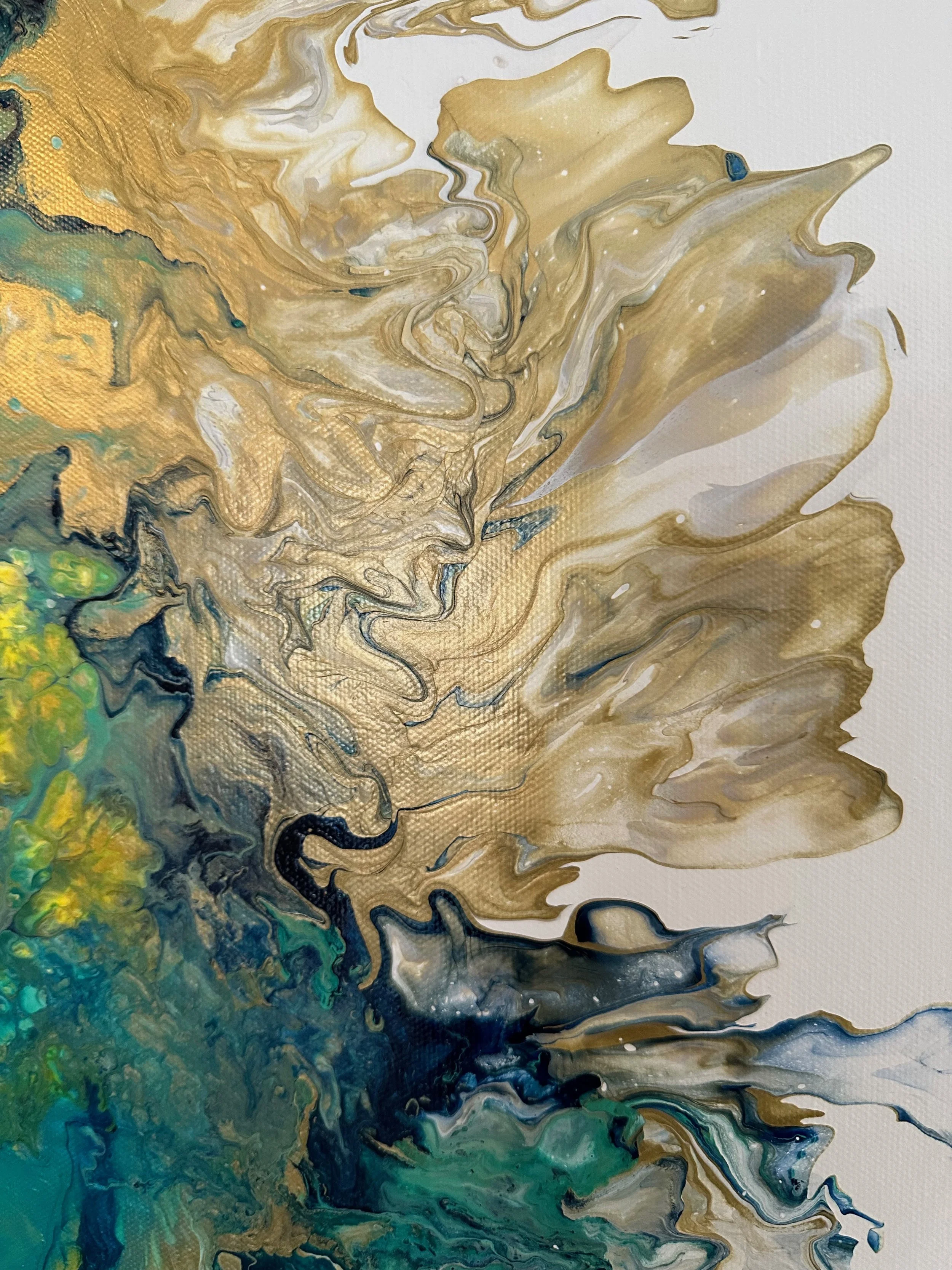 This painting was created to honor and parallel the words of our Lord and Savior, Jesus Christ. In the books of Matthew (19:13-14) and Luke (5:1-11) Jesus speaks commands that are powerful, yet comforting and full of compassion. The powerful combination of gentle directives is expressed through color. Deep viridian green and crystalline blue place us at the water’s edge where worship and healing take place at His feet. The expanse of white symbolizes The Holy Spirit - our ever-present comforter. White on white texture is used to guide the viewer to observe closely to see the unseen - a simple net floating on the edges of His words - Now go…Don’t be afraid…Let the children…All direct and clear instructions. The dichotomy of His words, both gentle and powerful, are represented with yellow (the joy of the Lord) and brilliant gold (the Word of God). All honor and glory be to Him.